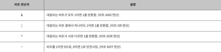 비트 연산자(bitwise operator)는 논리 연산자와 비슷하지만, 비트(bit) 단위로 논리 연산을 수행합니다.